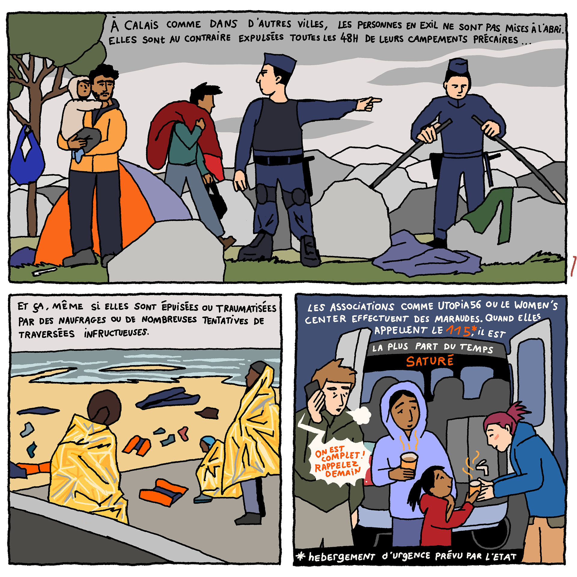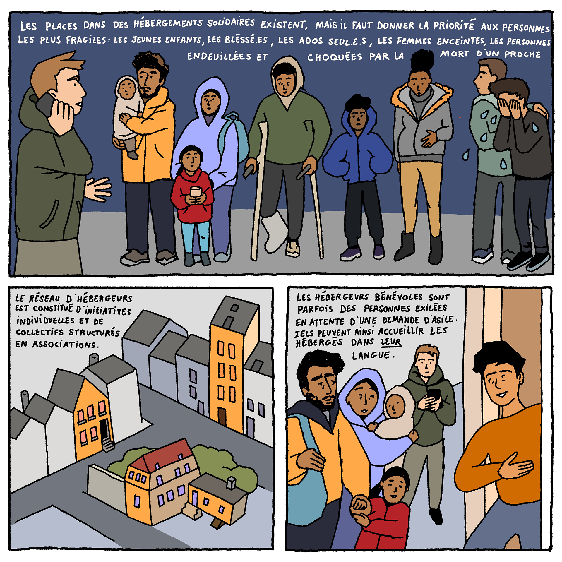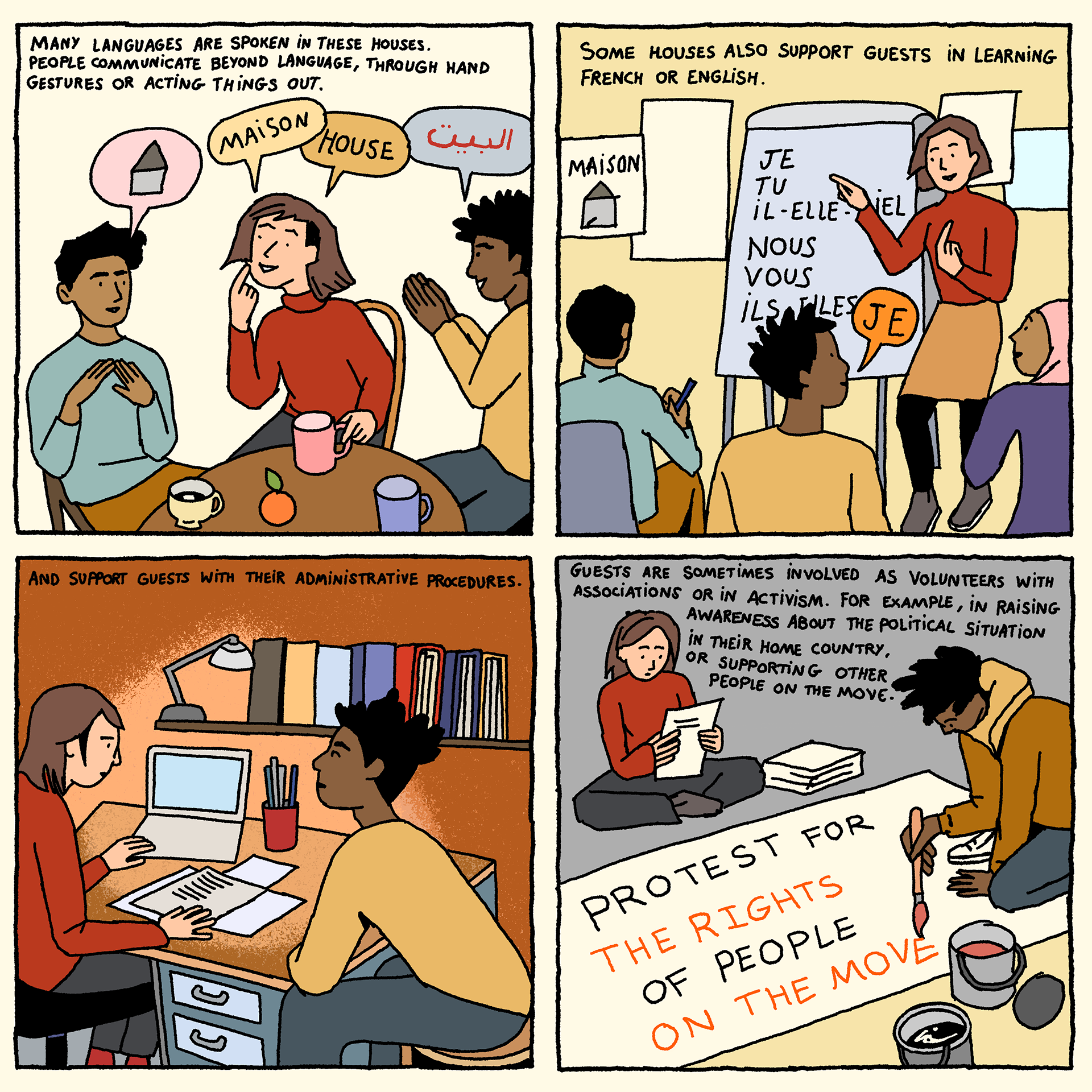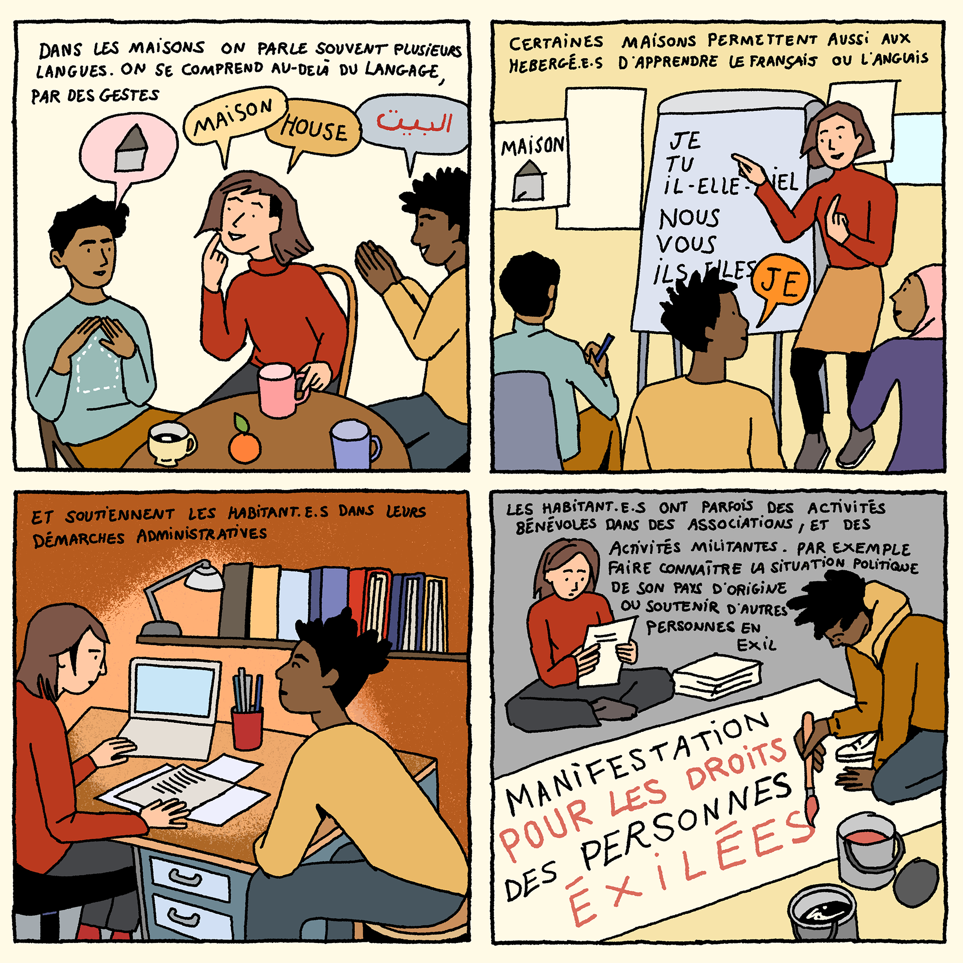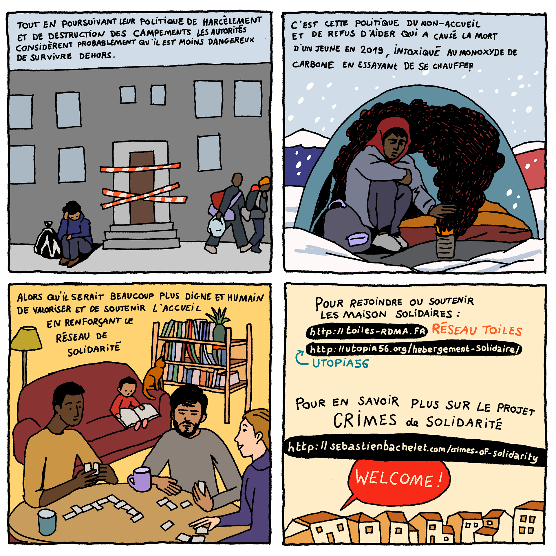Solidarity Houses - a comic-strip (available in French and English) by artist Loup Blaster exploring how citizens organise themselves to welcome exiled people amidst repression from the authorities (See below)