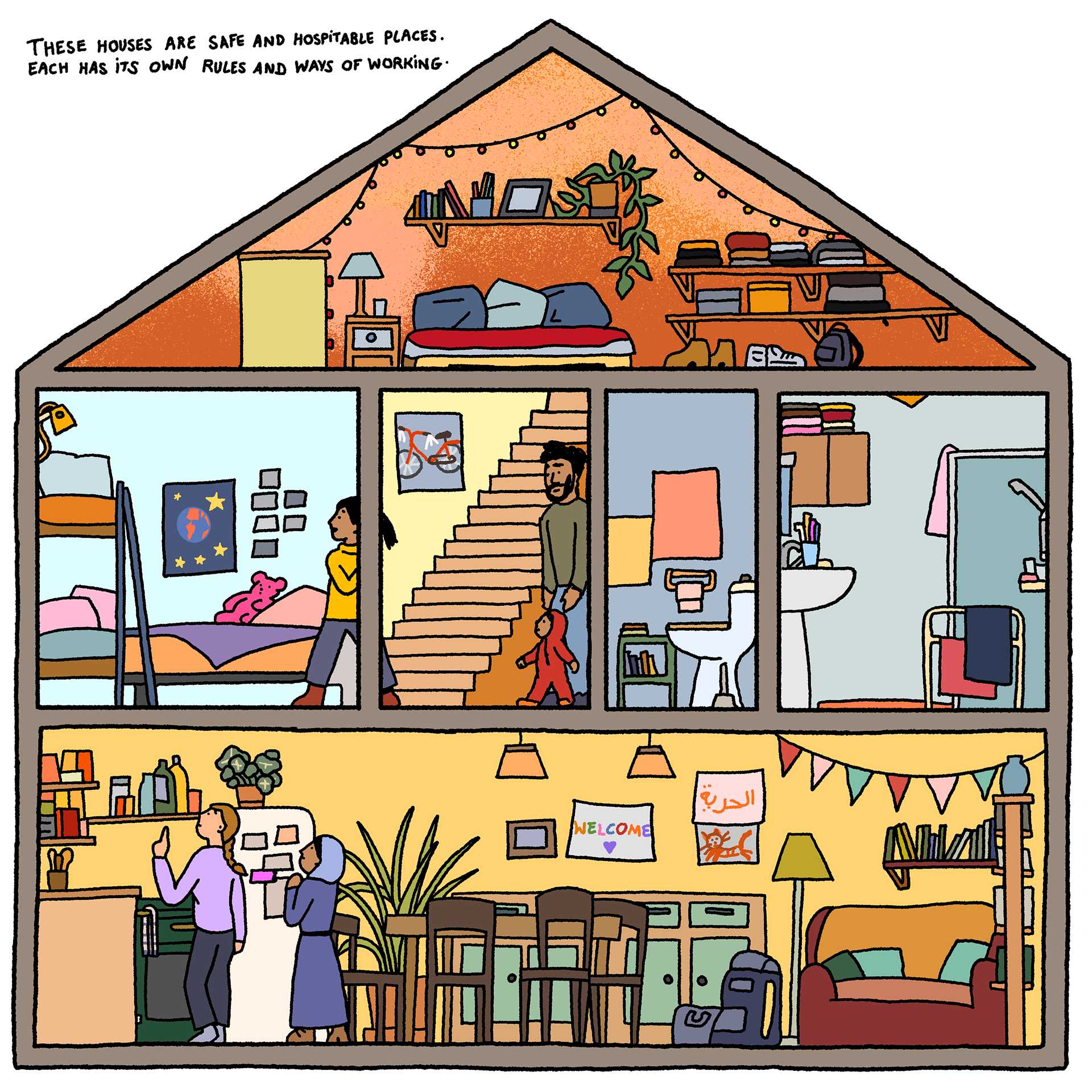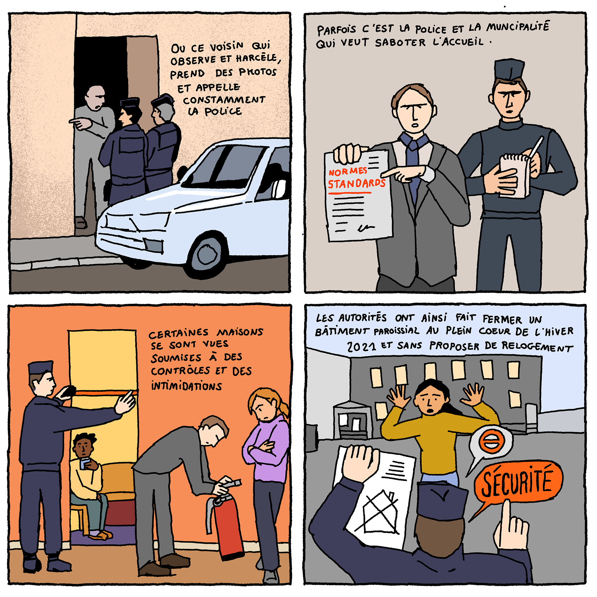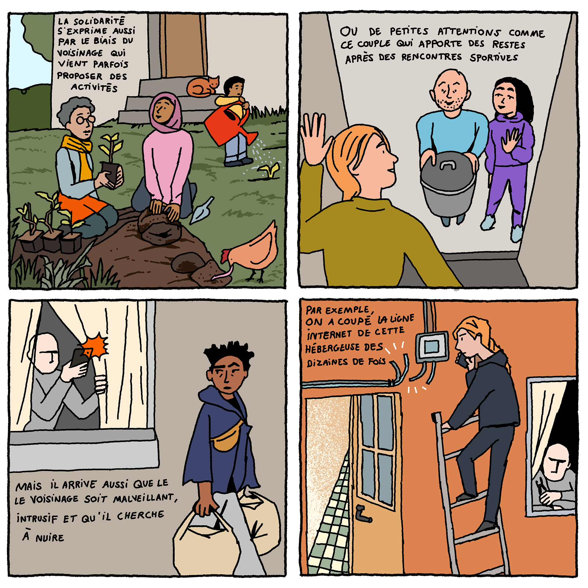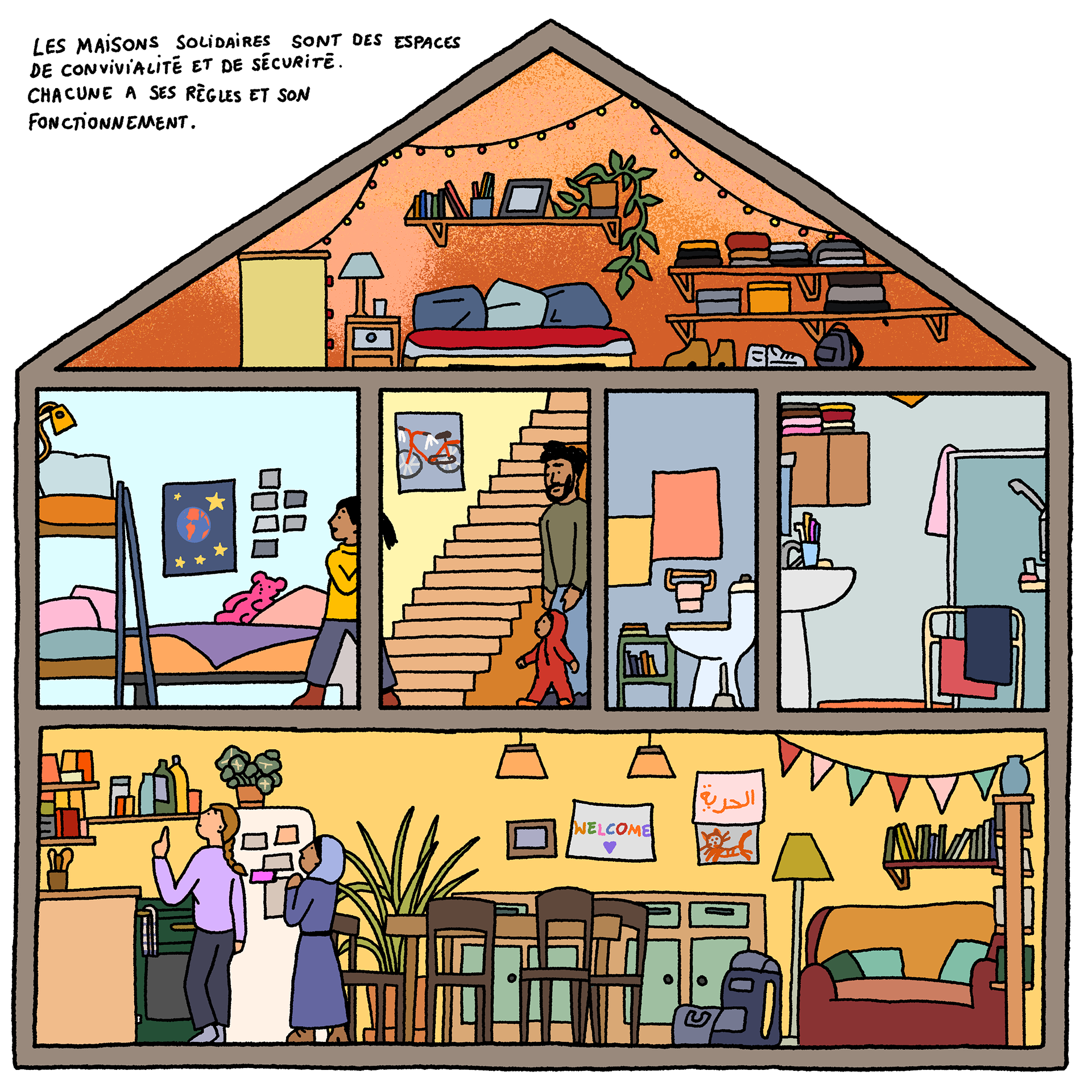Solidarity Houses - a comic-strip (available in French and English) by artist Loup Blaster exploring how citizens organise themselves to welcome exiled people amidst repression from the authorities (See below)