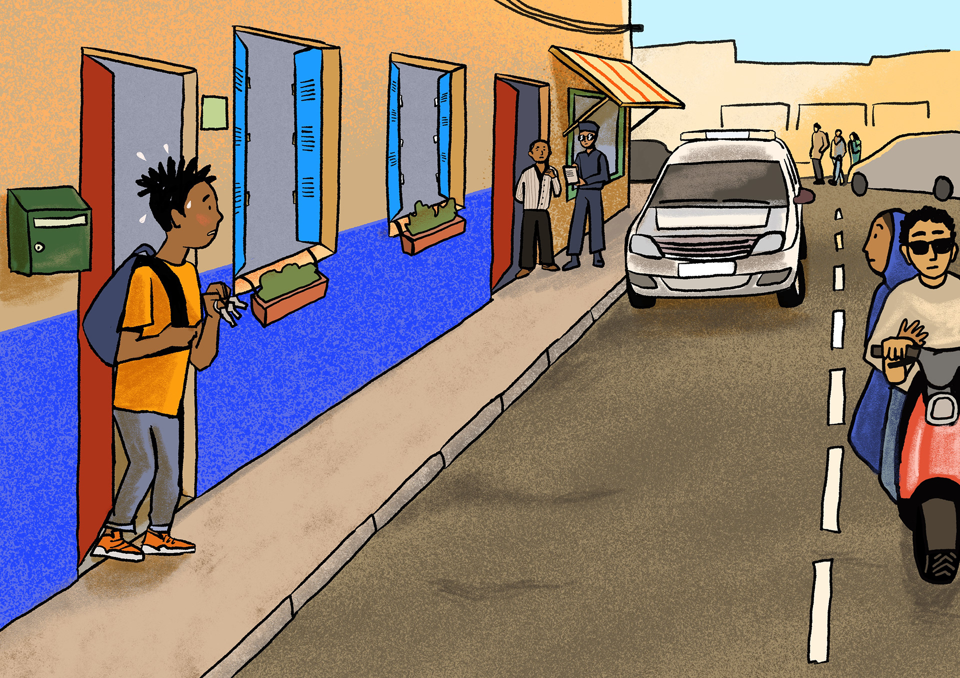 A series of illustrations for the report by Calais-based artist Loup Blaster – see below.